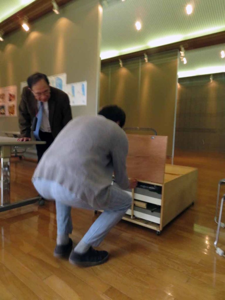 2日目、わかりやすく福島第一を伝えてくださる元東電職員の吉川さん。写真はボケちゃいましたが・・・同じ縮尺の象さんや2F建てのおうちと炉心。水色になっているあたりが(通常冷やされている)炉心。おうち2~3個分の高さの燃料をもつ1つの炉心から 一般家庭数千件分の電気が作られていたのだそうです。