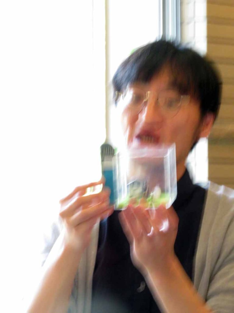 2日目も若林先生にお話いただきました。早くからお越しくださった男性も。原子力業界におられた吉川さんにも初めてのお話。画像右のカラフルなものは・・・世の中で確認されている1000を超える放射性物質を表す「核図表」。1つ1つが全く違う個性を持ちます。半減期1570万年など、ものすごく長い半減期のいくつかを減らす(けれど、高速炉タイプの原子炉か加速器が必要)という考え方へのお気持ちを伺っていきます。地下300m以深に1万年以上閉じ込めていく「高レベル放射性廃棄物」の最終処分の期間やスペースを軽減することを目的とした研究です。