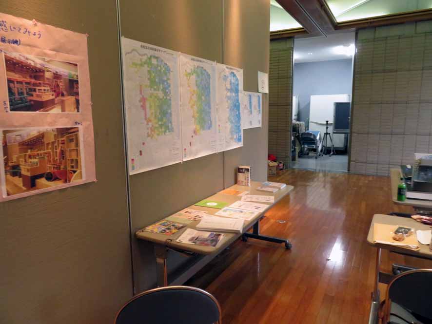 名古屋にて30年以上の活動実績を持つチェルノブイリ救援中部さんからわけていただいた、浪江町等々の空間放射線率の変化の地図。福島第一からの距離とは全く関係なく、たくさん放出された時の風向きで決まっていきました。山をいくつも超えて、事故とは全く無関係と思って住まわれていたかたたちの土地を汚染。他方全村避難した双葉が実は平常通り。。。そして、空間よりも土壌の変化のほうが鈍い(残っている)ことを確認する地図も。土壌のセシウムがなかなか減らないことが懸念されています。でも、チェルノブイリでの経験から菜種油にはセシウムが移行しにくい実績を示しておられ、菜種油「油菜(ゆな)ちゃん」をつくり、土壌のセシウムを残った茎や残渣に集めてバイオガス発電をにつなげようとしておられます。山菜・イノシシはじめその他食物中の測定経過も冊子にされています。